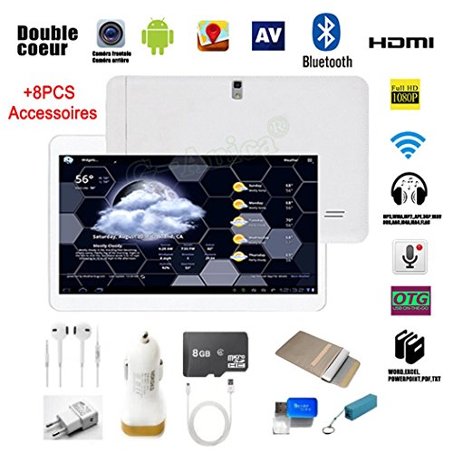 Quels sont les avantages et détail complet de G-Anica® Tablette Smartphone 10" (25,4cm) phablet débloqué 3G- Android 4.4, Dual Core, (1024x600 , Double caméra , Double Carte SIM, Bluetooth, Wi-Fi, 8Go ROM,1GBo RAM ),8 PCS Accessoires (Blanc) ? Voir complète du lien ci-dessous
