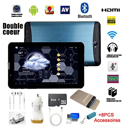 ce qui est caractéristique et spécification complète de G-Anica® Tablette Smartphone 7" (17, 78cm) phablet débloqué 3G- Android 4.2, Dual Core, (1024x600 , Double caméra , Double Carte SIM, Bluetooth, Wi-Fi, 4Go ROM,512MBo RAM ),8 PCS Accessoires (Bleu) ? Voir complète du lien ci-dessous