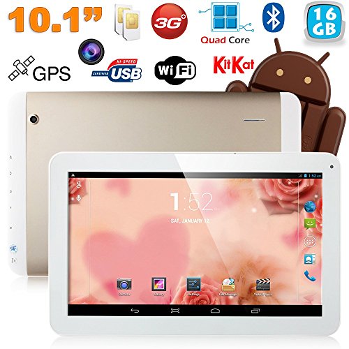 Quels sont les avantages et détail complet de Tablette tactile 10 pouces 3G Double SIM Quad Core WiFi GPS 24Go Or ? Voir complète du lien ci-dessous